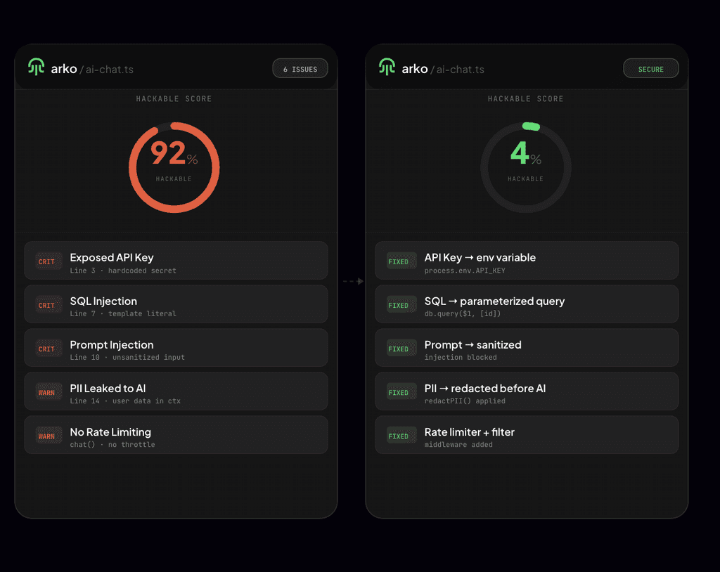 You're building apps and writing code faster than ever. But you may be missing critical security features that could be exploited. ARKO lives inside your code editor to reveal your security gaps based on context, fixes them, and proves they're gone - while you're still coding.