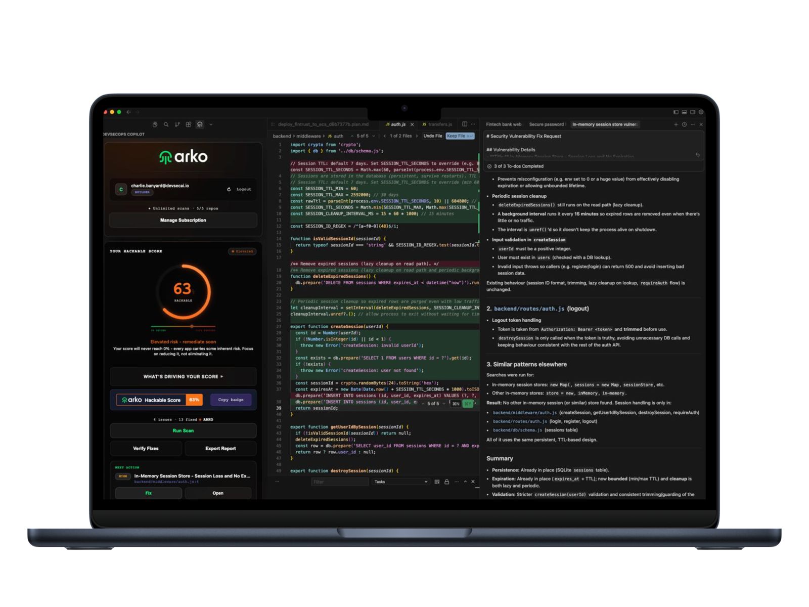 You're building apps and writing code faster than ever. But you may be missing critical security features that could be exploited. ARKO lives inside your code editor to reveal your security gaps, fix them, and prove they're gone – while you're still coding.